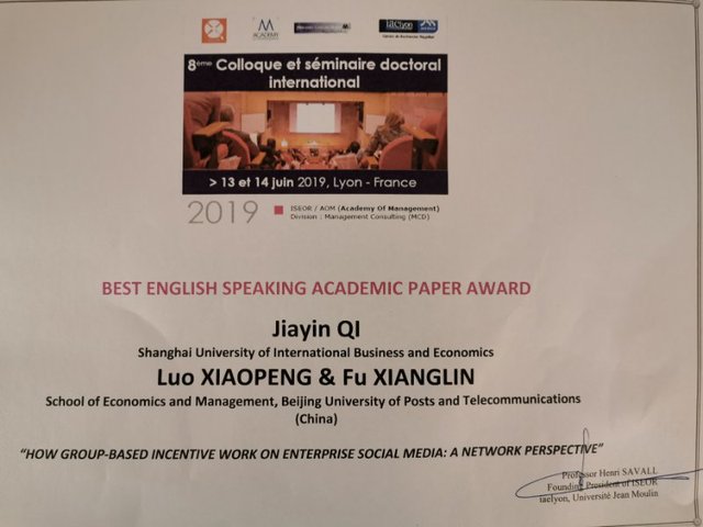 美国管理学学会(Academy of Management,AOM) 管理咨询分会 (Management Consulting Division, MCD)2019年国际会议暨博士生论坛(AOM MCD 8thINTERNATIONAL CONFERENCE AND DOCTORAL CONSORTIUM)于6月13日到14日在法国里昂的里昂第三大学举行。本次会议主要议题包括:变革管理的理论与实践、增强理论与实践关系的方法研究、变革管理绩效评估等。会议允许提交法文、英文、西班牙文三种语言的论文。会议录用论文179篇,参会人数200多人,覆盖全球四大洲的三十个多个国家和地区。我校齐佳音教授应邀出席会议并报告了研究团队合作完成的英语论文“How group-based Incentive work on enterprise social media: a network perspective”(群体激励如何在企业社交媒体中发挥作用:网络的视角),该论文获得本次会议最佳会议英文学术论文奖。