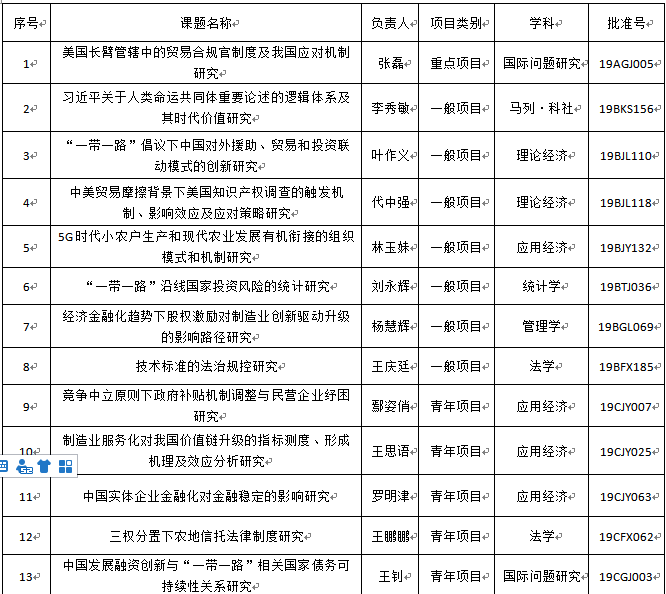 7月12日,全国哲学社会科学规划办公室正式公布了2019年国家社科基金项目年度项目、青年项目和西部项目立项名单,我校共有13项课题获批立项,包括1项重点项目、7项一般项目、5项青年项目,这是我校首次获得重点项目立项。我校今年国家社科基金立项数目在上海高校中排名第9。