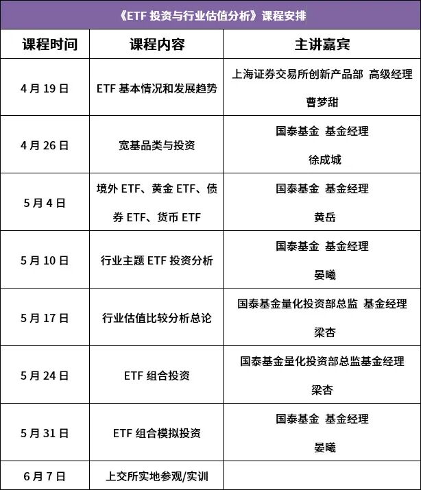 据了解,本次《ETF投资与行业估值分析》课程将分为八讲,第一讲为4月19日推出的“ETF基本情况和发展趋势”,主讲老师为上海证券交易所创新产品部曹梦甜;第二讲主题为“宽基品类与投资”,主讲老师为国泰基金经理徐成城;第三讲主题为“境外ETF、黄金ETF、债券ETF、货币ETF”,主讲老师为国泰基金经理黄岳;第四讲主题为“行业主题ETF投资分析”,主讲老师为国泰基金经理晏曦;第五讲主题是“行业估值比较分析总论”,主讲老师为国泰基金量化投资部总监、基金经理梁杏;第六讲主题是“ETF组合投资”,主讲老师为梁杏;第七讲主题是“ETF组合模拟投资”,主讲老师为晏曦;第八讲为上交所实地参观或实训。