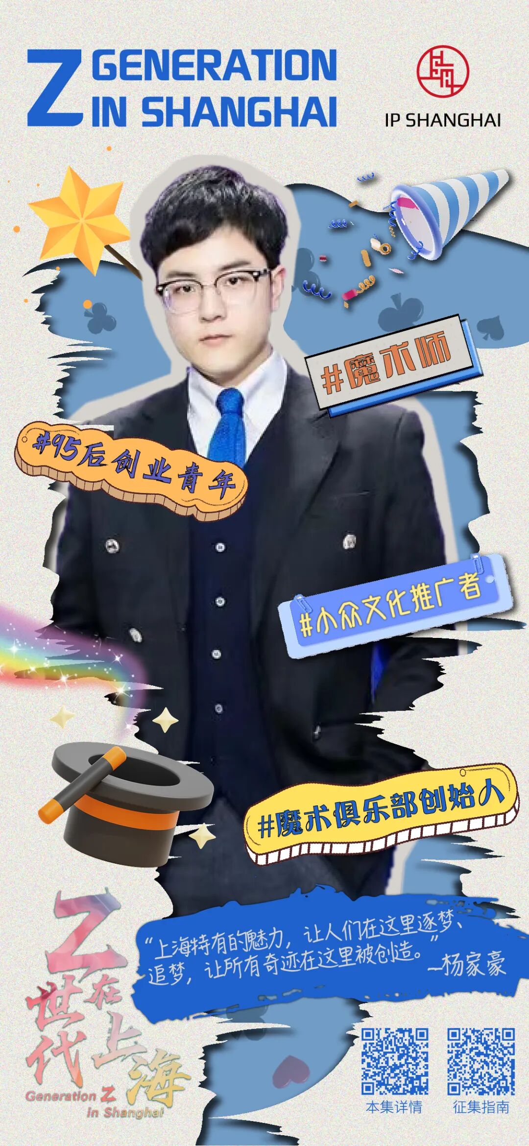 “上海有它特有的魅力,让人造梦、逐梦、追梦,让所有奇迹在这里被创造。魔术行业是舶来品,国外比较盛行,但在国内缺少一定传播度,在上海这样一个国际化大都市,魔术行业有较高的接受度和包容性。”杨家豪的魔术俱乐部,每周都会有定期演出,观众络绎不绝。甚至一些国际品牌的线下活动、私人聚会,也会邀请他们去表演。