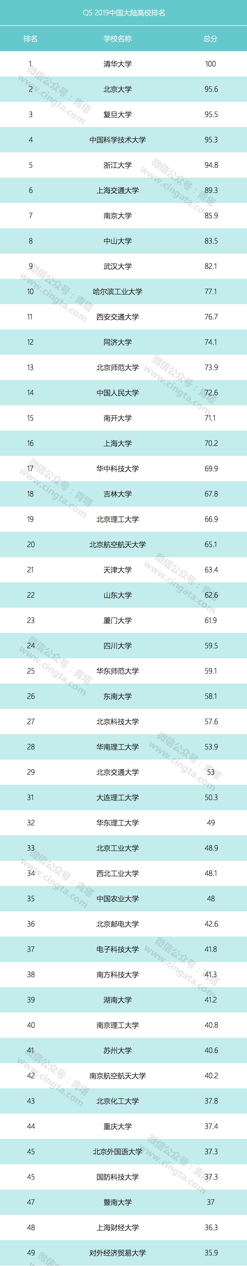 99所高校各项指标的得分数据可以点击左下角的“阅读原文”或直接访问青塔网(https://www.cingta.com)查看。QS 2019年中国大陆大学排名的详细名单和得分如下:
