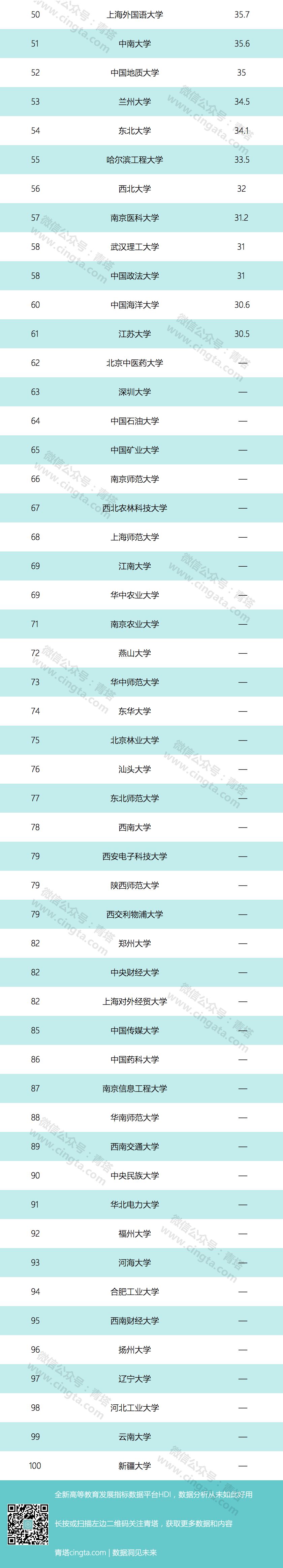 非双一流高校中,近年来发展迅速的新兴高校——南方科技大学居首,排名38位,超出大部分双一流高校。南京医科大学仅次于南方科技大学,排名57位。其他上榜高校还包括江苏大学(61位)、深圳大学(63位)、上海师范大学(68位)、燕山大学(72位)、汕头大学(76位)、西交利物浦大学(79位)、上海对外经贸大学(82位)、扬州大学(96位)等,上述高校基本都是综合实力较强的省属重点高校和发展较快的新兴高校。
