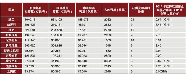 捷克、斯洛伐克、保加利亚、斯洛文尼亚四国所获欧盟基金预算占本国GDP比重为2018年数据,其他国家为2017年数据资料来源: