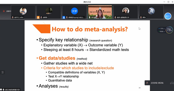 Invited by CLEAR, Dr. Liru Hu from The University of Hong Kong gave an online workshop entitled How to write your first meta-analytic article: Stepping into the invisible writing considerations of a published meta-analysis to our students and teachers on Tencent Meeting on December 16. The lecture was chaired by Professor Yuyang Cai, director of CLEAR. The workshop was swarmed with over 20 teachers and graduate and doctoral students from the Shanghai University of International Business and Economics, Shanghai International Studies University, East China Normal University, The Education University of Hong Kong, and The University of Hong Kong.