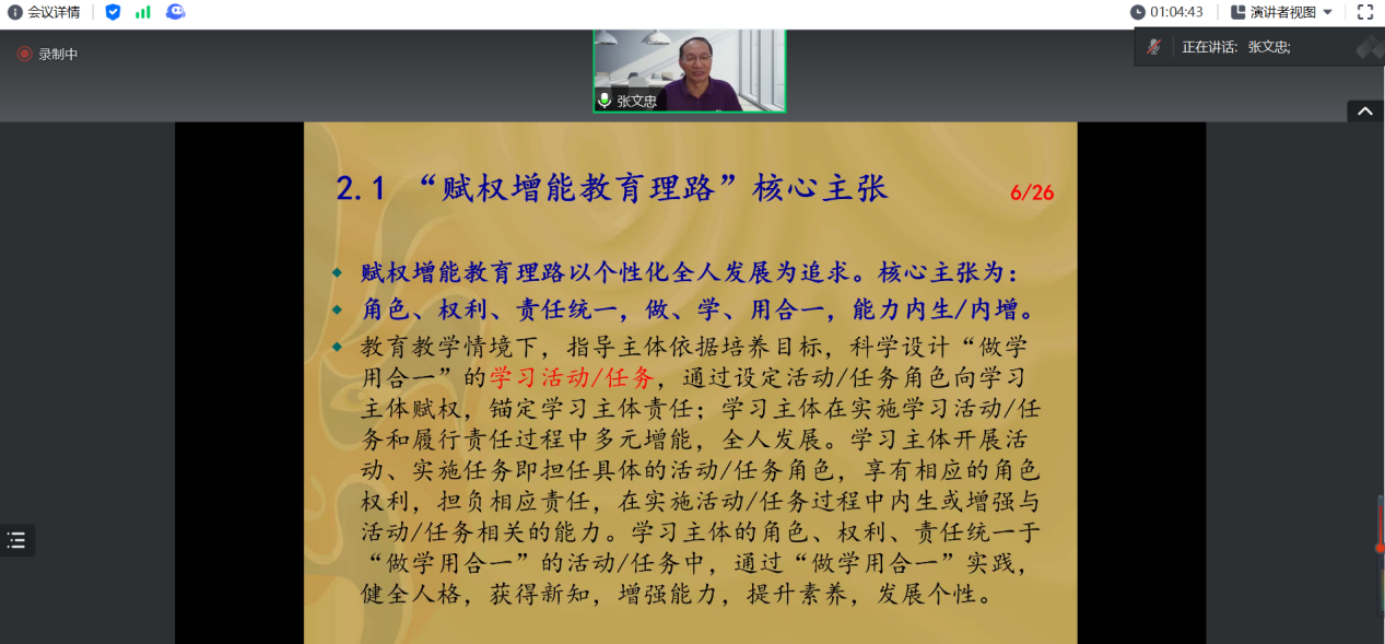 In the second part of the lecture, Professor Zhang provided a detailed introduction to the core propositions of the RightOempower Approach to Education, namely, the unification of roles, rights, and responsibilities; the integration of doing, learning, and applying; and the internal generation/improvement of capabilities. He explained related concepts of the RightOempower Approach to Education, including learning, foreign language learning, roles, guidance, activities, tasks, rights, responsibilities, and capabilities.