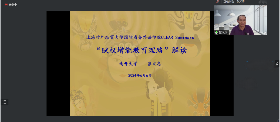 2024年6月6日,南开大学外国语学院张文忠教授应上海对外经贸大学语言教育与测评中心(CLEAR)邀请,为我院师生带来了一场主题为“赋权增能教育理路解读”的线上讲座。该场讲座由CLEAR中心主任蔡雨阳教授主持,整场报告吸引了来自上海外国语大学、西南交通大学、香港大学、北京教育科学研究院等多个高校的师生。