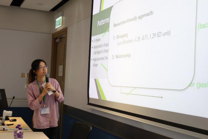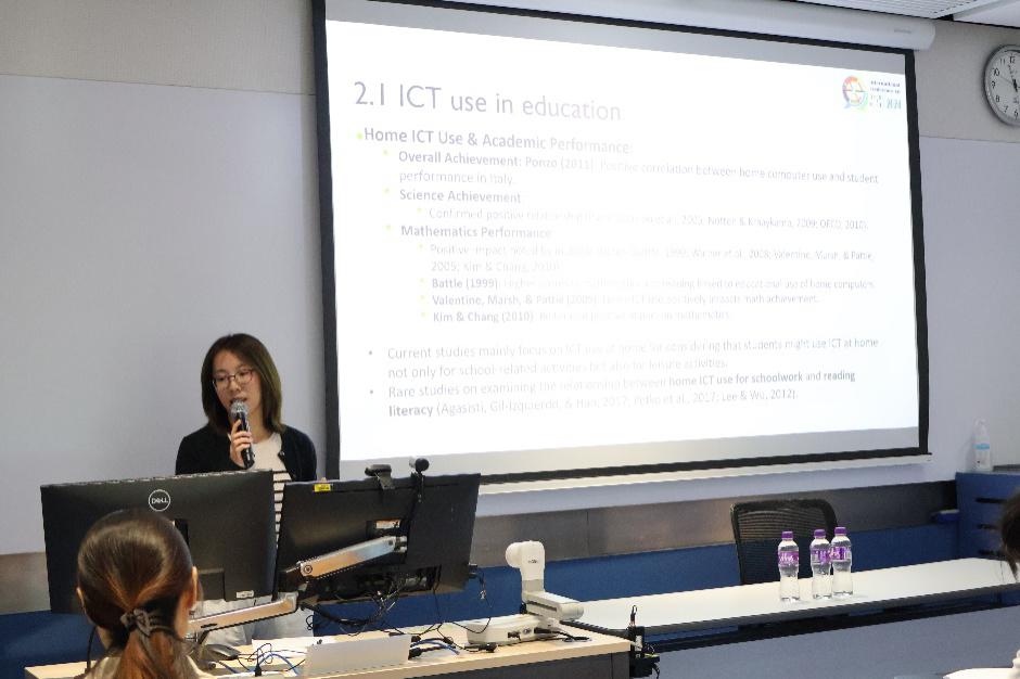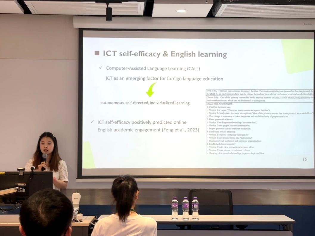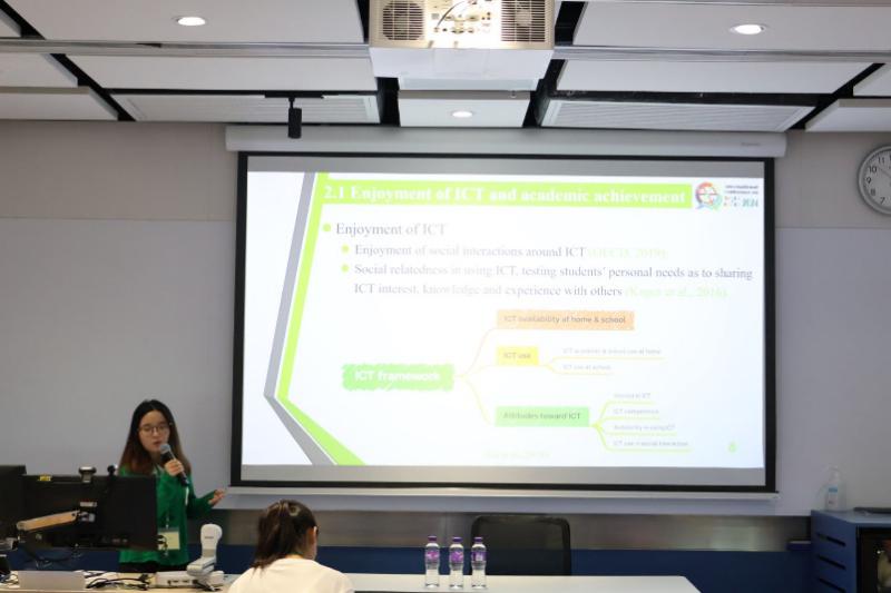 The third presenter, Ms. Qianwen Ge, explored the complex relationship between ICT self-efficacy and English reading achievement from the perspective of the Island Ridge Curve. The study revealed that basic ICT self-efficacy was positively correlated with English reading achievement among the medium achievers while negatively associated with English reading achievement among the high achievers. Advanced ICT self-efficacy was found to predict English reading achievement positively only among high achievers.