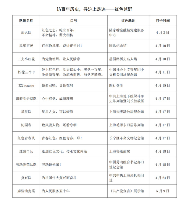 学生党支部牵头,招募发展对象和入党积极分子组成13支“越野“小分队,并邀请党员教师一同打卡13个沪上知名红色基地。每支队伍都有队名、口号和“神秘任务”,在红色基地打卡,并用手势100祝福党的百年生日。师生们一路真听、真看、真感受,在红色越野中共忆中国共产党的百年征程。