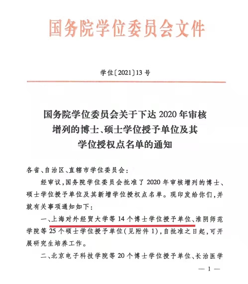 近日,国务院学位委员会正式下发了《国务院学位委员会关于下达2020年审核增列的博士、硕士学位授予单位及其学位授权点名单的通知》(学位〔2021〕13号),上海对外经贸大学等14所高校正式获批成为博士学位授予单位;上海对外经贸大学应用经济学一级学科获批为博士学位授权点,自批准之日起,可开展研究生培养工作。同时,学校还获批新增6个硕士专业学位授权点。博士学位授予单位的成功获批是学校建设和发展篇章中浓墨重彩的一笔,是学校历届领导班子和几代上经贸大人辛勤耕耘的结果,是学校发展史上重要的里程碑。自学校被列入《上海市新增博士学位授予单位建设规划》以来,学校党政领导班子高度重视,把申博工作作为学校加强内涵建设的头号工程来抓,细化为三年行动计划扎实推进实施,并提出了12字的申博工作方针,即:“坚定信心、举校一致、志在必得”。学校成立申博工作领导小组及办公室,全面梳理分析问题,制定年度任务分解表,责任到校领导、到单位(部门)、到具体负责人,集中精力补短板、强弱项、破难题,凝练学科建设目标和发展方向;学校领导班子成员主动靠前一步做工作,切实把分管领域的各项重点任务承担起来,必要时组织召开专题工作协调会,确