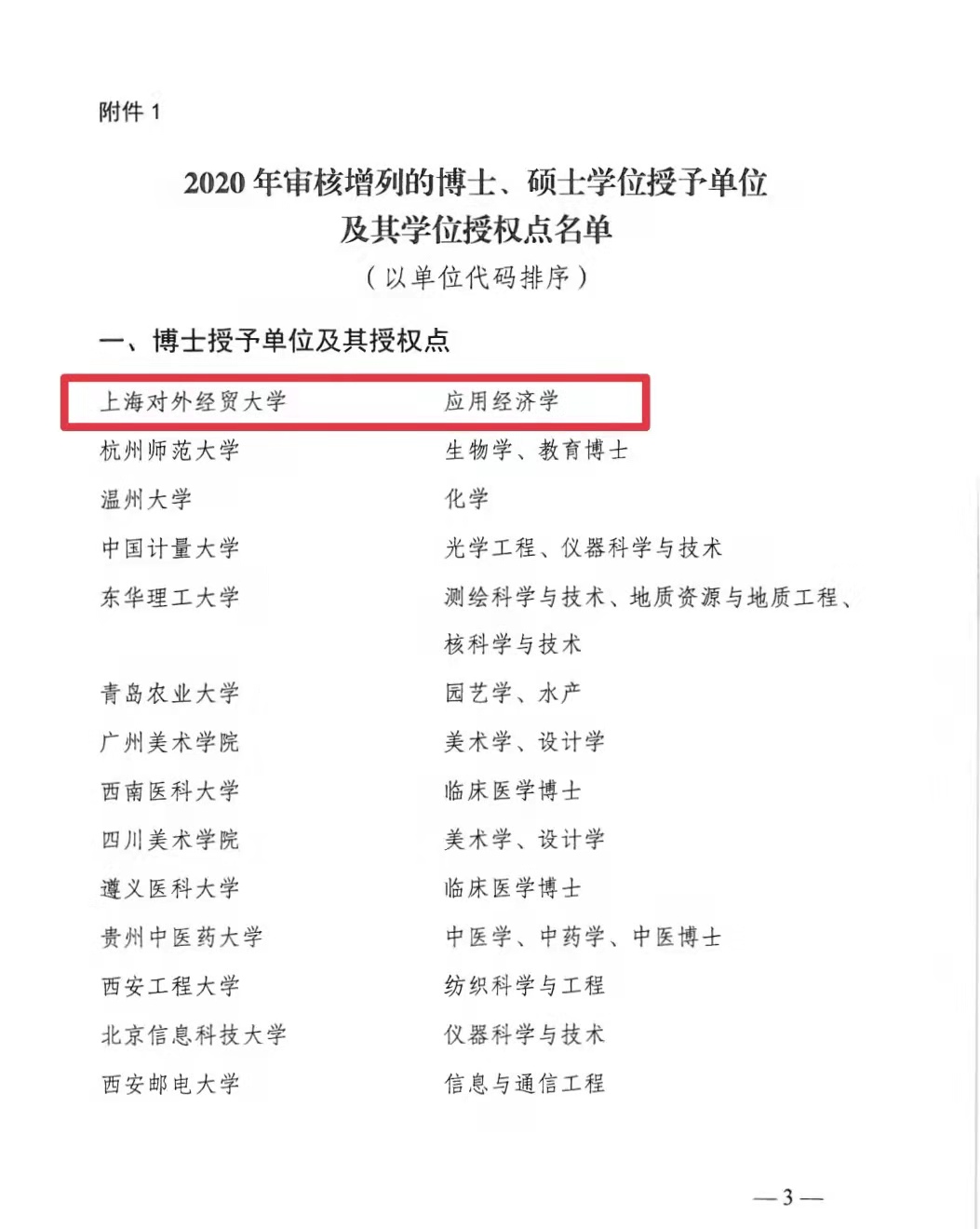 近日,国务院学位委员会正式下发了《国务院学位委员会关于下达2020年审核增列的博士、硕士学位授予单位及其学位授权点名单的通知》(学位〔2021〕13号),上海对外经贸大学等14所高校正式获批成为博士学位授予单位;上海对外经贸大学应用经济学一级学科获批为博士学位授权点,自批准之日起,可开展研究生培养工作。同时,学校还获批新增6个硕士专业学位授权点。