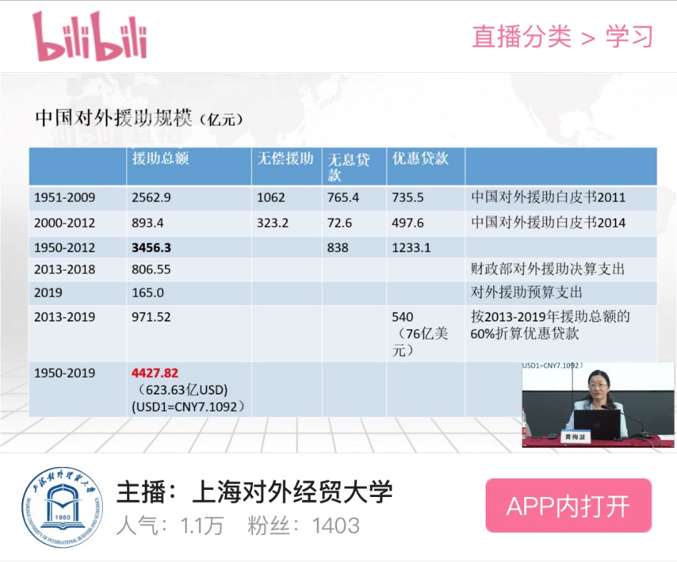 6月24日下午,黄梅波教授在上海对外经贸大学研究生院校庆系列活动“学术中国”(第一季)(在上海对外经贸大学哔哩哔哩平台直播),做了第3期讲座,题为“中国的对外援助及其改革”的学术讲座。讲座由党委研工部副部长、研究生院副院长乔檀主持。1.1万余名师生在线收看了讲座。讲座在剖析了发达援助国及传统的国际发展援助体系的基础上,重阐述了新兴援助国及中国对外援助的规模、援助方式和援助的效果及有效性,并探讨了中国对外援助管理体系的演进及其改革方向。