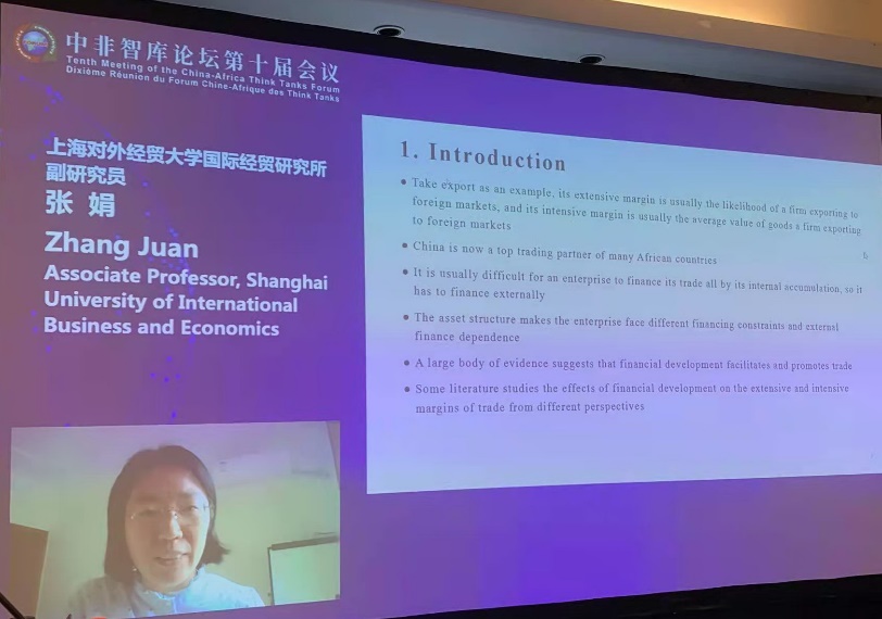 1021日,张娟参加中非合作论坛中方后续行动委员会秘书处主办,浙江师范大学、浙江省人民政府外事办公室、塞内加尔谢赫·安达·迪奥普·达喀尔大学联合承办的中非智库论坛第十届会议线上会议,在第一分议题“中非合作论坛新规划与中非命运共同体构建”发言,发言题目:“Impacts of Financial Development on Trade Margins: Evidence from China-Africa Trade”
