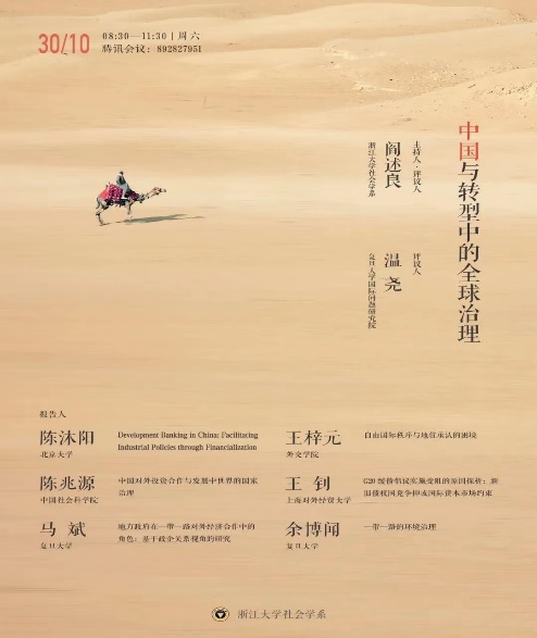 2021年10月30日,浙江大学社会学系主办“中国与转型中的全球治理”学术研讨会。来自浙江大学社会学系、北京大学国际关系学院、外交学院国际关系研究所、中国社科院世经政所、复旦大学国际问题研究院、复旦大学国际关系与公共事务学院、以及上海对外经贸大学国际发展合作研究院的专家学者与会发言,讨论热烈。学会研讨会围绕“中国与转型中的全球治理”展开,6位发言人分别就开发性金融机构、自由国际秩序、中国的国际经济合作、全球债务治理、一带一路建设和全球环境治理等议题发言,重点阐述中国在其中的角色,以及如何推动相关议题领域的全球治理实现建设性革新。会议同时通过线上直播形式与社会大众沟通,100余位线上用户参与旁听了该会议,产生了良好的社会效果。