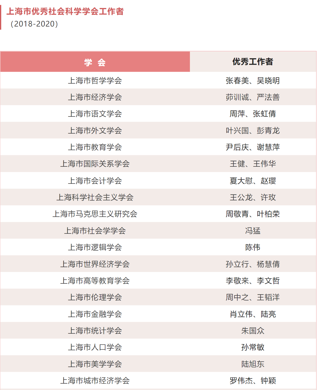 2021年11月17日,上海市社联为推动本市社会科学学会和民办社会科学研究机构的培育和建设,提高管理水平,充分发挥其在社会主义经济建设、政治建设、文化建设、社会建设、生态文明建设中的各项功能,开展了2018-2020年度上海市优秀社会科学学会、上海市优秀民办社会科学研究机构、上海市优秀社会科学学会工作者、上海市社会科学学会特色活动、上海市社会科学学会品牌活动的评选工作。经申报、初审、互评、终评和社联党组审核通过,现将评选结果予以公布。希望各学会和民办社科研究机构在今后的工作中再接再厉,促进上海社会科学事业繁荣发展,为实现第二个百年奋斗目标、实现中华民族伟大复兴的中国梦而不懈奋斗。