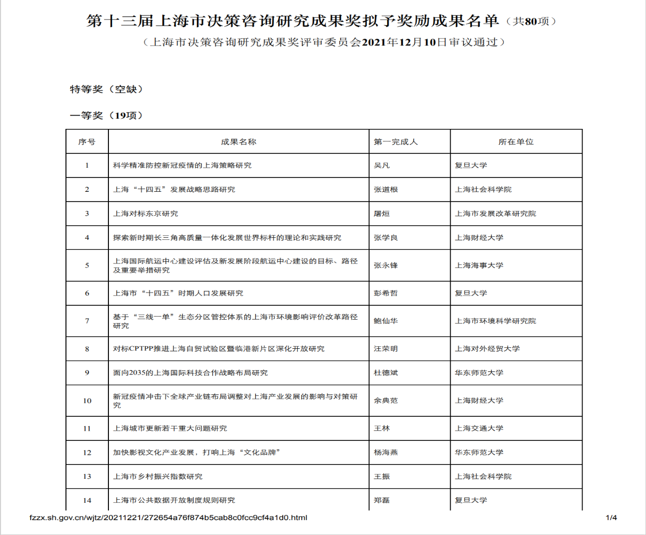 20211221日,经上海市决策咨询研究成果奖评审委员会审议通过,《科学精准防控新冠疫情的上海策略研究》等80项成果拟获第十三届上海市决策咨询研究成果奖。根据《上海市决策咨询研究成果奖励规定》及其实施细则的相关规定,现将拟予奖励的研究成果名称等信息予以公示,公示期为30天(从本公告发布之日起计算)。