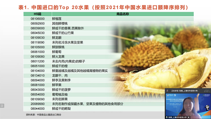 2022年5月25日下午,第五届进博会食品展区水果专场推介会暨水果行业发展新机遇在线论坛成功举办。上海对外经贸大学国际经贸研究所张娟副研究员分享了中国水果进口贸易的现状、RCEP实施后水果进口的机遇和挑战,特别分析了RCEP成员国水果相关产业国际投资的新规定、关税减让给企业带来的成本下降等问题。
