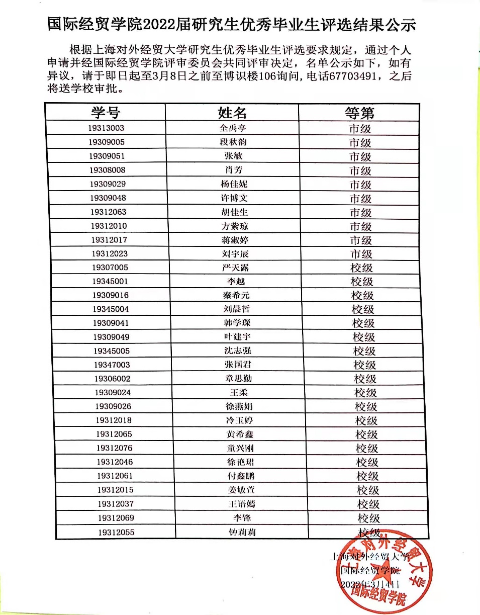 黄梅波指导的2019级硕士研究生胡佳生、方紫琼、段秋韵获2022上海市优秀毕业生,秦希元获校优秀毕业生