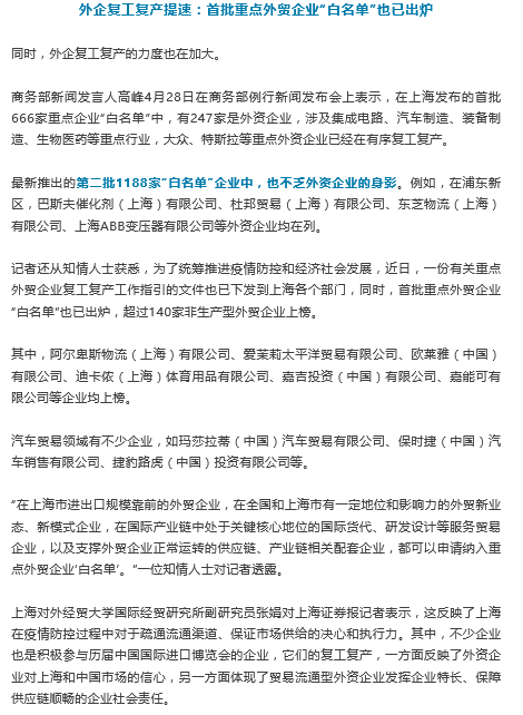 相关内容见4月30日的新闻报道《上海首批重点外贸企业“白名单”出炉!首个市级方舱医院关舱!长三角海关保障产业链供应链安全畅通!严查快处“大礼包”腐败》。