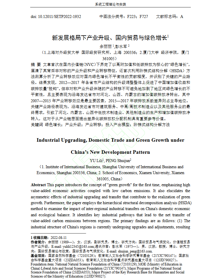 余丽丽副研究员论文“新发展格局下产业升级、国内贸易与绿色增长”在《系统工程理论与实践》发表(网络首发)