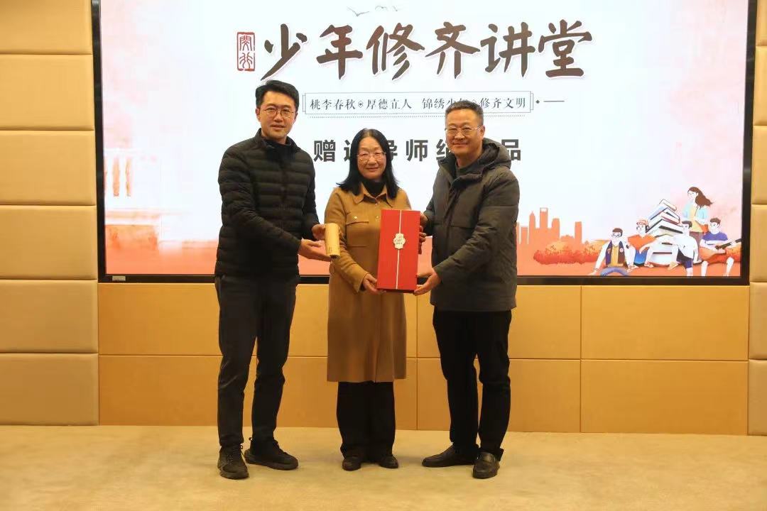 闵行区委宣传部副部长、文明办副主任许新江、闵行区教育局党工委副书记徐明怡为黄梅波颁发了闵行区“少年修齐讲堂”讲师聘书和纪念照。