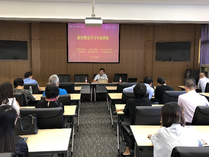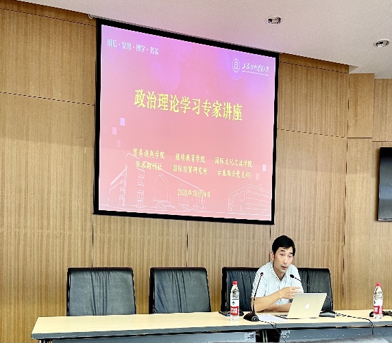 2021年10月14日下午,贸易谈判学院、继续教育学院、国际文化交流学院、学术期刊社、国际经贸研究所和古北联合党支部等古北校区5家单位举行联组学习,邀请学校上海教卫党委系统“优秀共产党员·师德标兵”詹德斌教授作党史学习教育与师德师风专题讲座,并领学“习近平总书记给全国高校黄大年式教师团队代表重要回信精神”。通过本次专题辅导讲座,参会各单位教职员工进一步深化了对“抗美援朝精神”的理解,加深了对党史学习教育和深入开展“我为群众办实事”实践活动重要意义的认识。
