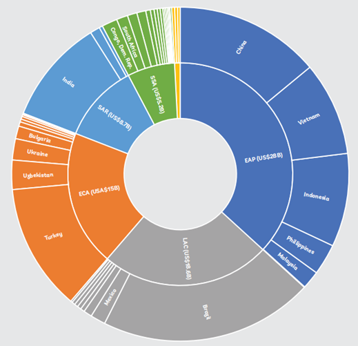 图3 中低收入国家2021年PPI投资分地区和国家统计