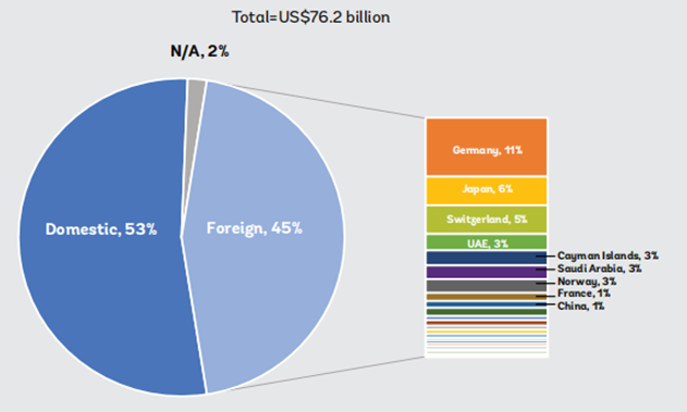 从投资人国别来看,2021年的240个项目中,28%的项目(67个)其股权主要由国际实体持有(2020年这一比例为44%),这些项目的73%是能源项目。接受国际投资最多的两个地区是撒哈拉以南非洲地区(SSA)、欧洲和中亚地区(ECA)。SSA地区的国际投资人主要来自法国,而ECA地区的国际投资人主要来自沙特。中国、巴西和印度的PPI项目投资主要来自本国。就投资总额而言,国际实体的投资占到45%(340亿美元),其中来自德国和日本的投资排在前2位,如图2所示。