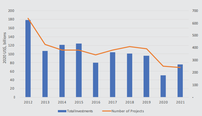 从投资总额和项目个数来看,2021年,PPI投资项目(简称PPI项目)总投资为762亿美元,比2020年增加49%,显示出明显的复苏迹象,但仍比2016-2020年的平均水平低12%。从PPI项目数量来看,2021年PPI项目数共240个,比2020年减少4.4%。