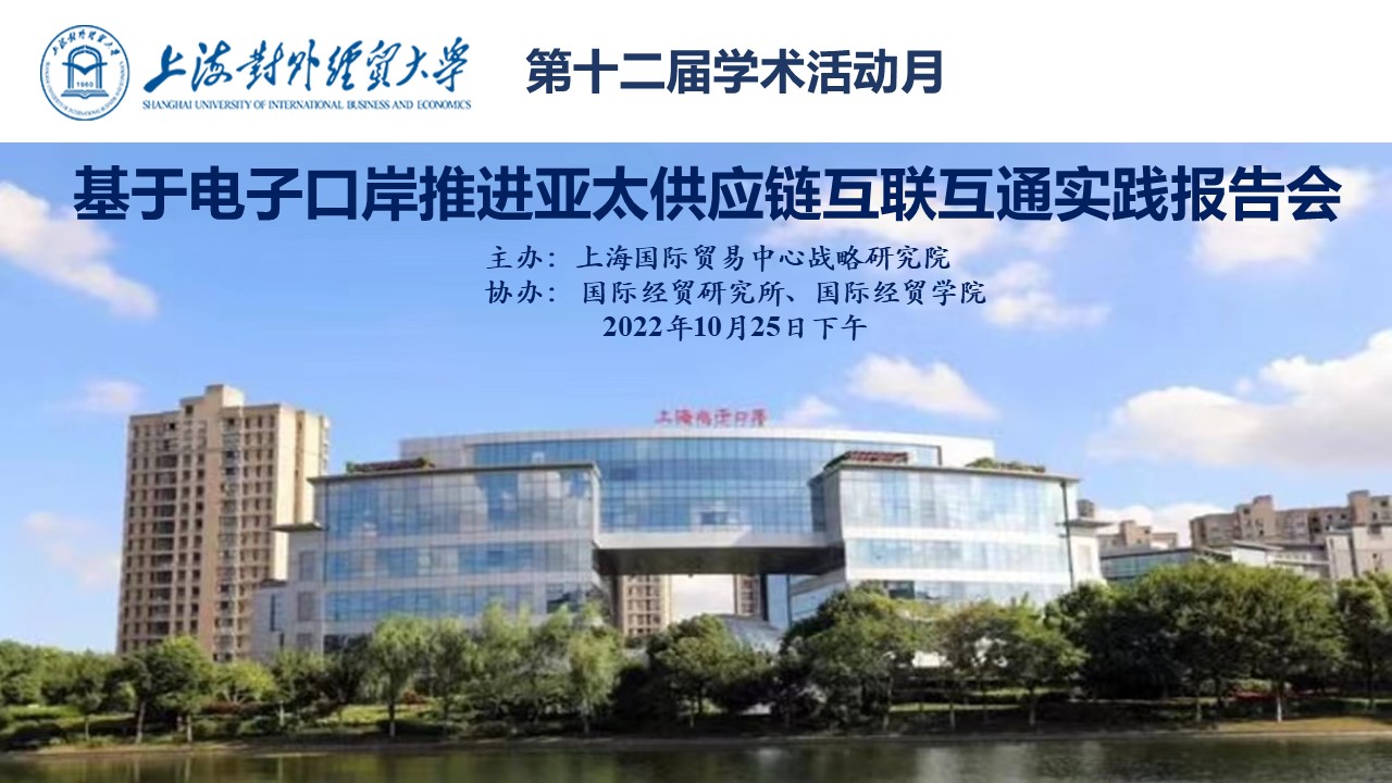 10月25日,由上海对外经贸大学上海国际贸易中心战略研究院主办,上海对外经贸大学国际经贸研究所、国际经贸学院协办的“基于电子口岸推进亚太供应链互联互通实践报告会”开幕。来自上海亚太示范电子口岸网络、上海亿通国际股份有限公司、上海对外经贸大学的大约30名校内外专家和学生通过腾讯会议参加了本次会议。