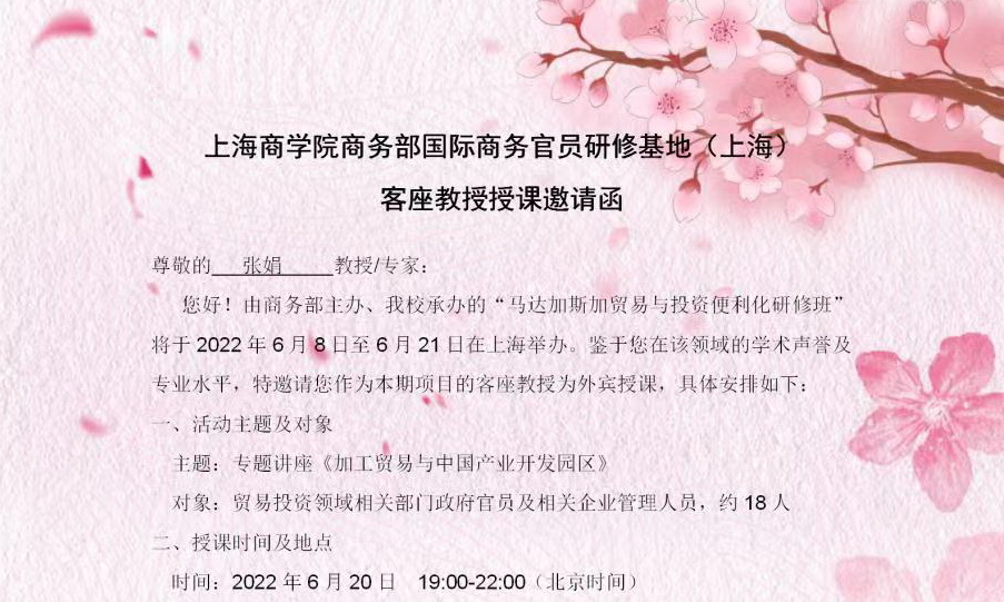 日,受到上海商学院邀请,国际经贸研究所张娟副研究员为商务部主办的马达加斯加贸易与投资便利化研修班授课,讲授“加工贸易与中国产业开发园区”。