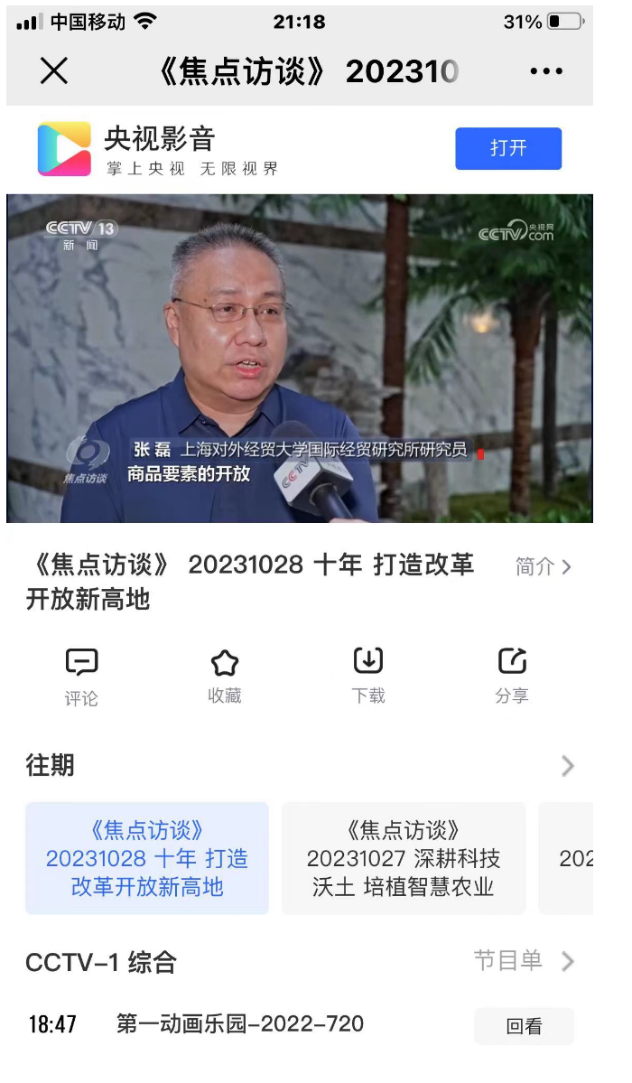 张磊研究院接受央视《焦点访谈》采访,谈上海自贸区试验区十年成就,详细报道链接见:https://baijiahao.baidu.com/s?id=1781052709666789519&wfr=spider&for=pc
