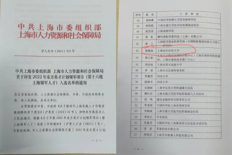 黄梅波教授获2022年东方英才计划领军项目(第十六批上海领军人才)