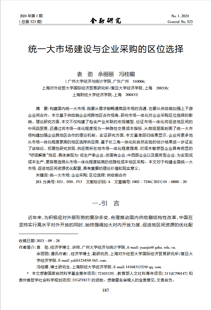 袁劲,余丽丽,冯桂媚. 统一大市场建设与企业采购的区位选择[J]. 金融研究, 2024年第1期.