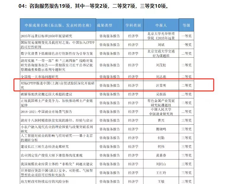 汪荣明、姚为群、张娟、李墨丝、张磊等参与的《对标CPTPP推进中国(上海)自贸试验区深化开放研究》获得第九届高等学校科学研究优秀成果奖(人文社会科学)咨询服务报告类别,二等奖,2024年2月6日公示,张娟负责国际投资研究,李墨丝负责数字贸易研究,张磊负责服务贸易研究。