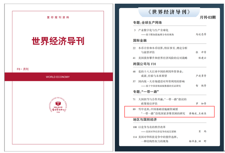 近日,国际经贸研究所所长黄梅波教授与2022级应用经济学博士生、国际经贸学院国际发展合作专业王婕佳同学合作完成的学术论文《雪中送炭:中国基础设施融资减缓“一带一路”沿线国家多维贫困的研究》,获人大复印报刊资料《世界经济导刊》2025年第3期全文转载。这是对该论文在国际发展合作研究领域的学术价值与现实意义上的高度认可,也充分展现了我所在应用经济学博士研究生培养方面的卓越成效。