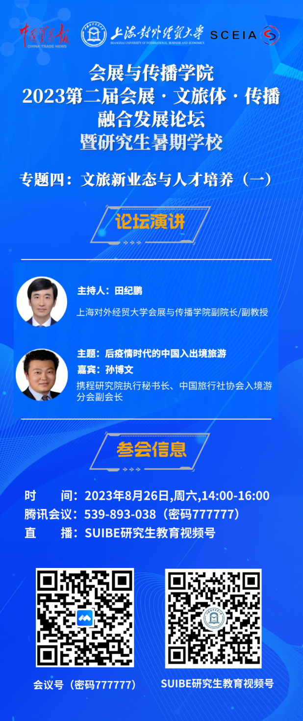 8月26日至27日,由上海对外经贸大学、《中国贸易报》社和上海市会展行业协会主办,上海对外经贸大学会展与传播学院、上海对外经贸大学研究生院和长三角会展研究院承办的2023第二届会展·文旅体·传播融合发展论坛暨研究生暑期学校融合发展论坛演讲板块之“专题四:文旅新业态与人才培养”在线顺利举行。携程研究院执行秘书长、中国旅行社协会入境游分会副会长孙博文和全国MTA教指委与教育部旅游管理类教指委委员、中国海洋大学MTA教育中心主任、旅游学科学术带头人、教授、博士生导师张广海分别作为演讲嘉宾为本届暑期学校带来了最后一个专题的精彩演讲。为期两天的论坛由上海对外经贸大学会展与传播学院副院长、副教授田纪鹏主持。