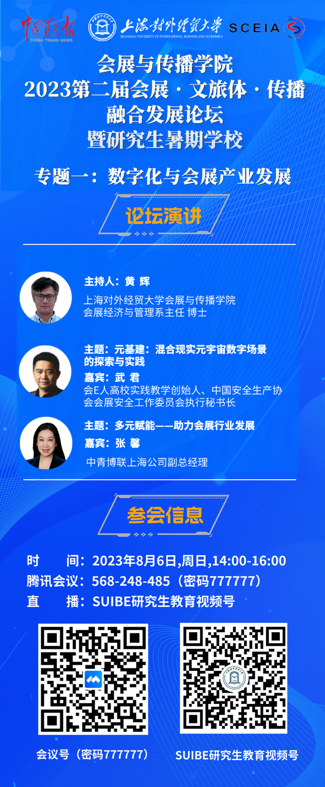 8月6日,由上海对外经贸大学、《中国贸易报》社和上海市会展行业协会主办,上海对外经贸大学会展与传播学院、上海对外经贸大学研究生院和长三角会展研究院承办的2023第二届会展·文旅体·传播融合发展论坛暨研究生暑期学校融合发展论坛板块“专题一:数字化与会展产业发展”在线顺利举行。会E人高校实践教学创始人、中国安全生产协会会展安全工作委员会执行秘书长武君,中青博联上海公司副总经理张馨,担任演讲嘉宾,论坛由上海对外经贸大学会展经济与管理系主任黄辉博士主持。