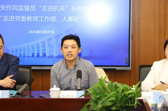为锲而不舍落实中央八项规定精神,推进作风建设常态化长效化,进一步发挥机关作风监督员作用,畅通机关与基层师生之间的互融互促渠道,建立健全以“内驱动力+外部监督+双向沟通”三位一体的作风建设长效机制,持续深化作风建设合力,不断促进机关管理服务提质增效,10月21日下午,机关党委组织开展作风监督员“走进机关”系列活动之“走进党委教师工作部、人事处”。学校第一届机关作风监督员、党委教师工作部、人事处班子成员和科室负责人和机关党委有关同志共同参加了本次活动。活动由机关党委书记范登峰主持。