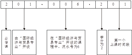 ⑹以“国际贸易实务”课程为例,其课程代码为“201.006.2”,某个学期的课程序号为“201.006.201”,各位数字代表的含义如图1所示。