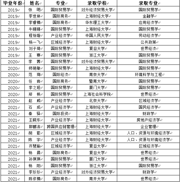 附表 2019—2021年国际经贸学院考取国内重点高校博士研究生概况