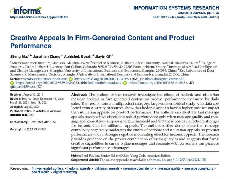 由上海对外经贸大学人工智能与变革管理研究院齐佳音教授作为共同通讯作者的学术论文“Creative Appeals in Firm-Generated Content and Product Performance”发表于信息系统领域国际顶尖学术期刊《Information Systems Research》(UTD-24 Journal, SCI, IF=5.207)。