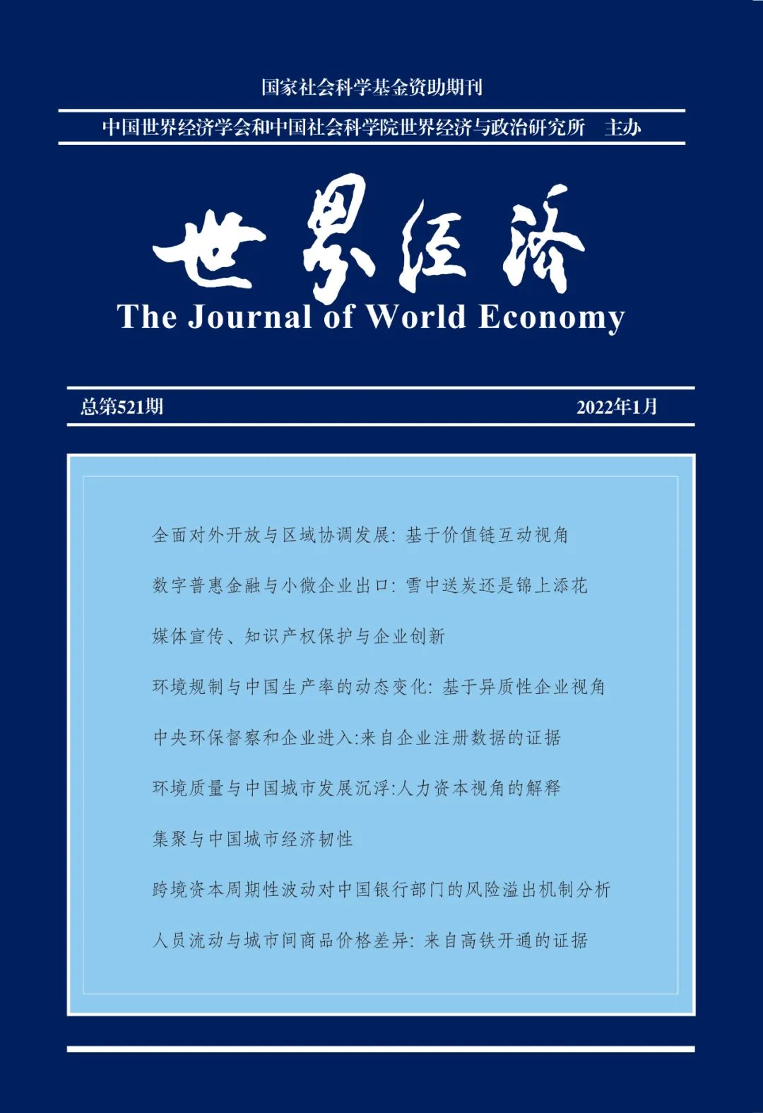国内期刊方面,国际经贸学院何欢浪教授、章韬副教授与其合作者的论文《媒体宣传、知识产权保护与企业创新》和国际经济贸易研究所余丽丽助理研究员与其合作者的论文《全面对外开放与区域协调发展:基于价值链互动视角》,在国内经济学科中文权威期刊《世界经济》2022年第1期同期刊出。前者通过收集中国省级官方媒体对知识产权的宣传倾向信息和企业层面的专利信息,实证检验官方媒体关于知识产权保护的宣传对中国企业创新的影响,研究认为官方媒体关于知识产权保护的宣传对企业创新具有正向的激励作用,不仅促进了企业专利数量的增长,还推动了企业专利质量的提升。后者在价值链互动视角下,分析了外需对国内垂直分工和协调发展的促进作用,并识别了其中关键的生产层级特征和生产路径分布。研究结果有助于从推动形成全面对外开放新格局以及促进产业空间合理分布等层面,为提升区域发展水平和质量,实现区域协调发展提供有益参考。国际经济贸易研究所铁瑛副研究员与其合作者的论文《贸易中介、信息不对称与不稳定出口关系》在国内经济学科中文权威期刊《中国工业经济》刊出。论文基于2000—2016年的长观察窗口识别了中国的不稳定出口关系,尝试在信息不对称背景下从贸易中介视角对不稳定出口关系的发生进行解释,论文认为不稳定出口关系是中国出口广泛存在且不容忽视的组成部分,推进出口“稳中求进”有赖于引导和规范贸易中介行为,降低企业出口固定成本。