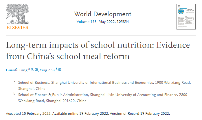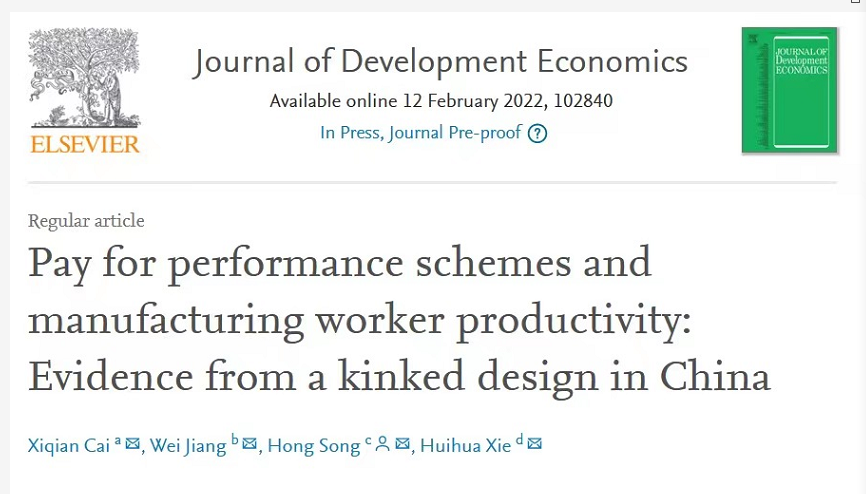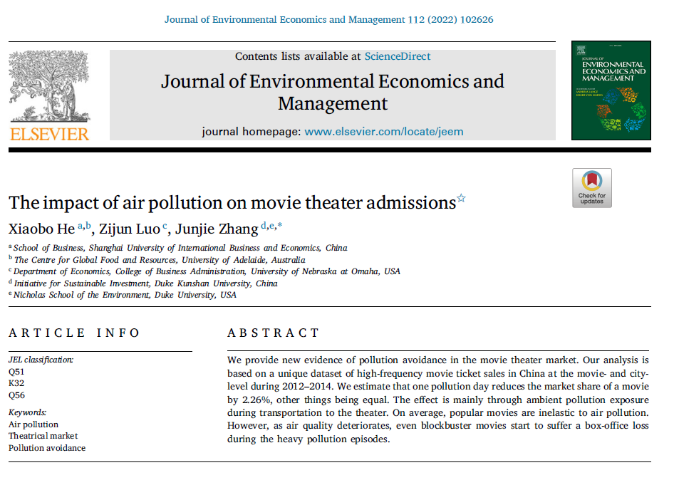 国际期刊方面,国际经贸学院姜微副教授与其合作者撰写的论文“Pay for performance schemes and manufacturing worker productivity: Evidence from a kinked design in China”被发展经济学国际顶级期刊Journal of Development Economics正式接受,于今年2月在线发表;论文使用一家中国一次性纸杯制造企业的生产和薪酬数据考察了非线性绩效工资制度对雇佣工人劳动生产率的影响。论文的研究发现有助于理解企业雇员的差异化在薪酬体制的设计和效果中所起的作用,并为现代制造业生产中越来越多地采用非线性绩效工资制度提供了新的见解。国际经贸学院何晓波副教授与其合作者撰写的论文“The impact of air pollution on movie theater admissions”被环境经济学国际顶级期刊《Journal of Environmental Economics and Management》正式接受,于今年2月在线发表。论文收集了2012-2014我国“电影—城市”双重维度的高频票房销售数据并构建了独有的数据集,研究发现:在其他条件相同的情况下,一个污染日(空气污染指数超过100)会减少一部电影的市场份额2.26%。国际经贸学院方观富讲师与其合作者撰写的论文“Long-term impacts of school nutrition: Evidence from China’s school meal reform”在发展经济学权威期刊World Development正式刊出。论文评估了农村义务教育学生营养改善计划的长期影响,结果发现童年时期曝露在学生营养改善计划下,能显著改善个人成年时期的认知能力和健康状况。