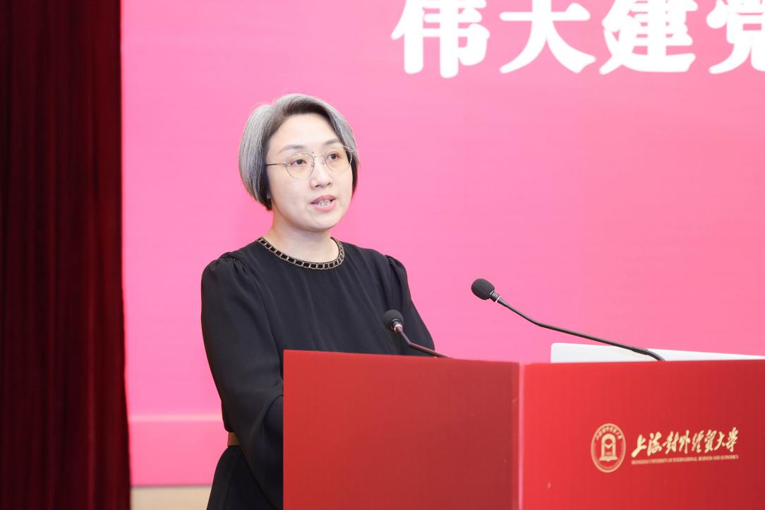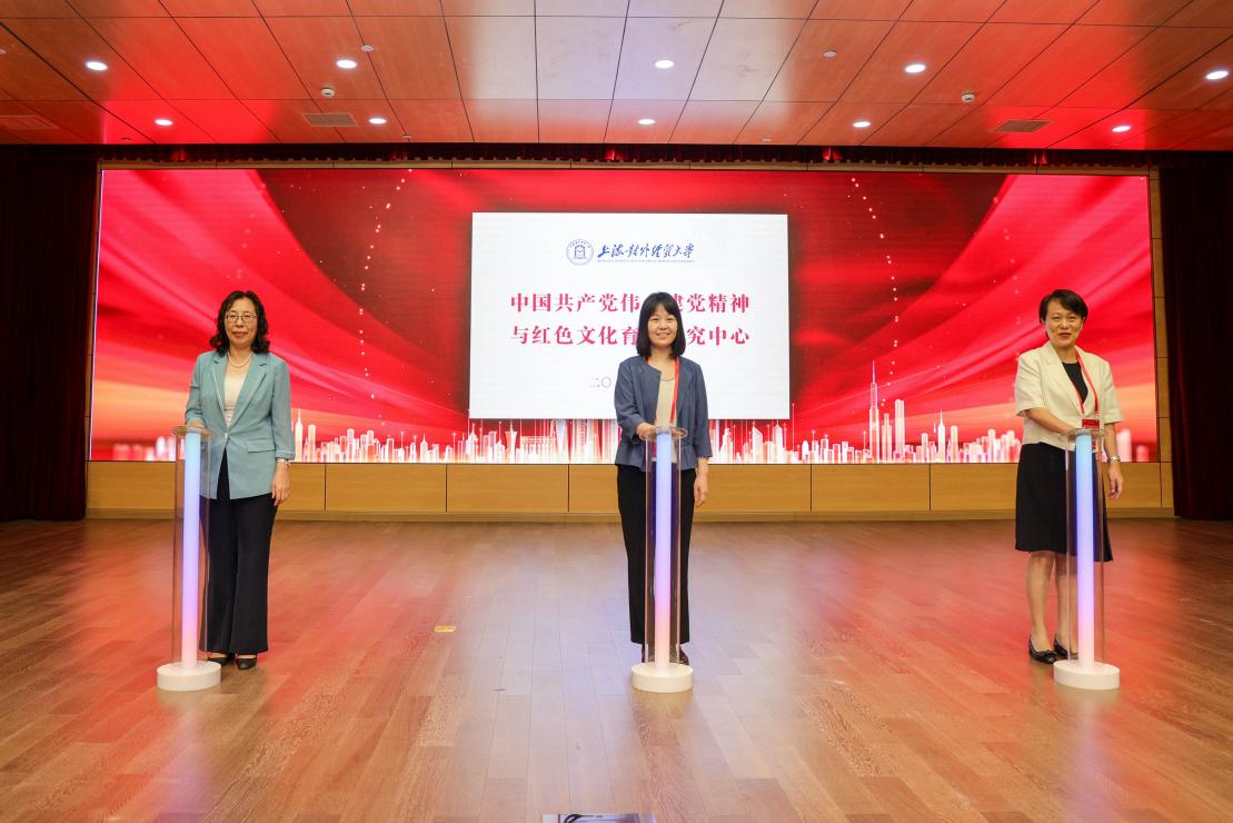 上海市教卫工作党委宣传处处长耿绍宁,上海市教育科学研究院副院长、德育发展研究院院长王戎,上海对外经贸大学马克思主义学院院长秦淑娟为上海对外经贸大学中国共产党伟大建党精神研究与红色育人研究中心共同揭牌。