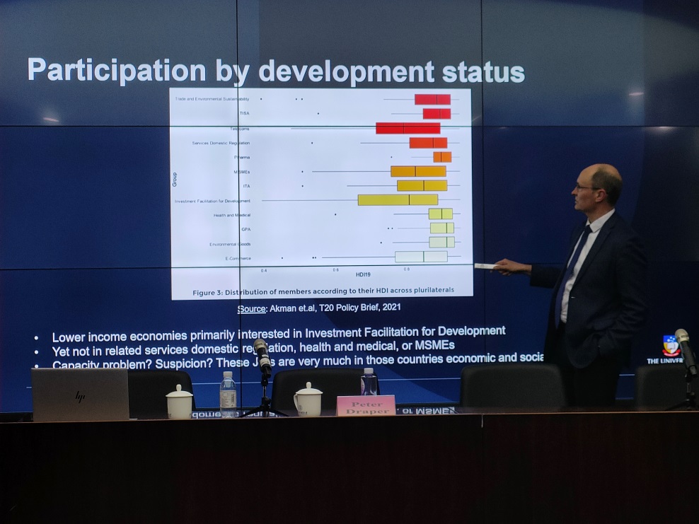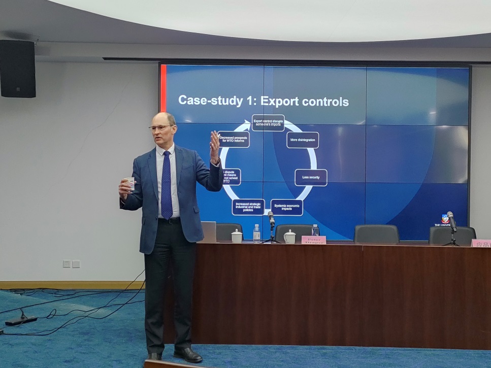 Peter Draper教授分析了当今国际贸易合作的现状,特别是受新冠疫情和俄乌冲突等地缘政治影响导致的国际贸易合作环境逐渐恶化的背景,以及世界贸易组织改革当前面临的主要挑战,包括但不限于出口管制、跨区域的电子商务监管以及跳出世贸组织框架的区域贸易协定等,并在此基础上提出了他对改革世界贸易组织和重振多边贸易体系的见解和建议,他与在座师生还进行了互动交流。