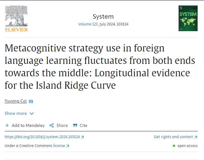 近日,我校国际商务外语学院蔡雨阳教授独著论文Metacognitive strategy use in foreign language learning fluctuates from both ends towards the middle: Longitudinal evidence for the Island Ridge Curve在SSCI顶级期刊System线上发表(2022年影响因子6.0,语言类期刊排名7/287)。这是蔡雨阳教授在System期刊上连续发表的第二篇论文,也是继2020年他在语言类顶级期刊Language Testing发表论文之后的又一篇顶级期刊论文。