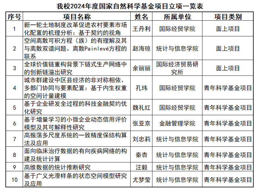 日前,国家自然科学基金委发布了《关于2024年国家自然科学基金集中接收申请项目评审结果的通告》,公布了2024年度国家自然科学基金面上项目、重点项目、部分重大项目、青年科学基金项目等的评审结果,我校共获得国家自科基金项目立项10项,其中面上项目3项、青年科学基金项目7项。
