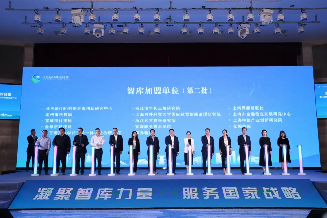 会上,举行了长三角G60科创走廊高端智库联盟第二批智库加盟仪式,人民日报中国城市报长三角研究院、上海财经大学长三角与长江经济带发展研究院、华东师范大学长三角一体化法治研究院、申银万国证券研究所、上海对外经贸大学国际经贸创新治理研究院、浙江大学嘉兴研究院、宣城职业技术学院等20家智库加入G60高端智库联盟。