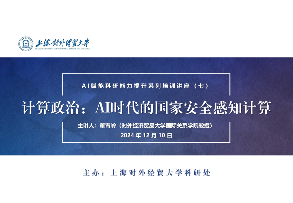 2024年12月10日,由上海对外经贸大学科研处主办的“AI赋能科研能力提升系列培训讲座”第七期顺利举行。本次讲座由对外经济贸易大学国际关系学院国家安全计算实验室的董青岭教授主讲,主题为“AI时代的国家安全感知与计算”。