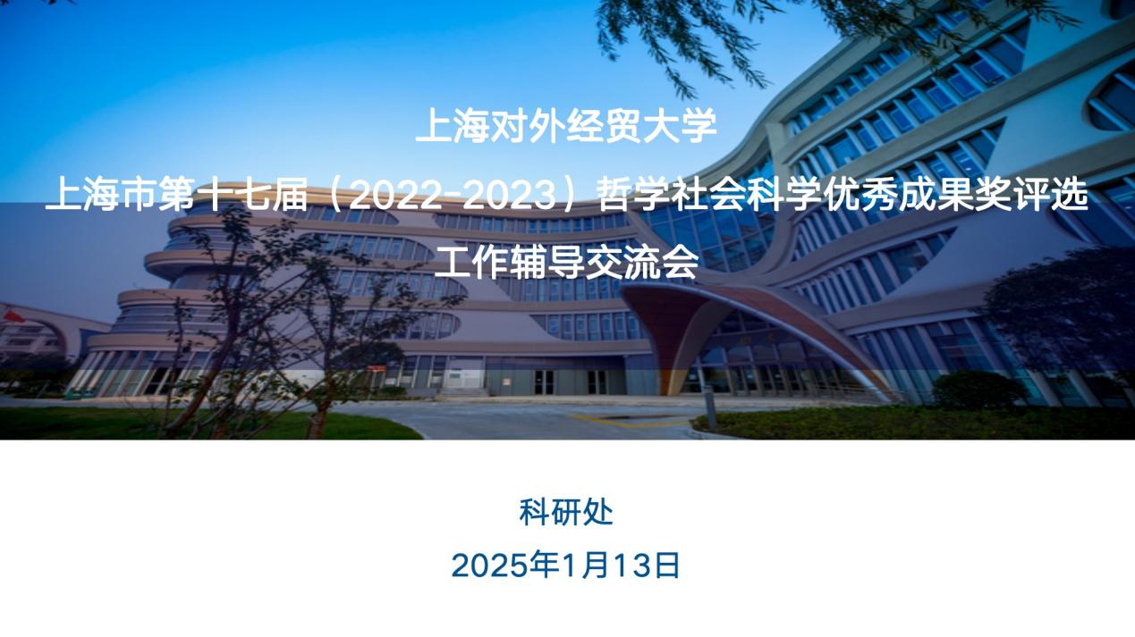 科研处处长闫海洲做动员讲话,他指出上海市哲学社会科学优秀成果奖是面向党的创新理论和哲学社会科学研究领域设立的市级奖项,由中共上海市委宣传部、上海市社会科学界联合会组织实施,每两年评选一次,对于教师个人成长和学校发展具有重要意义,希望符合申报条件的老师们能积极参与申报。科研处张淑怡老师,围绕社科类成果主要奖项、申报要求及申报材料的准备要求对我校第十七届哲学社会科学优秀成果奖申报工作作介绍。